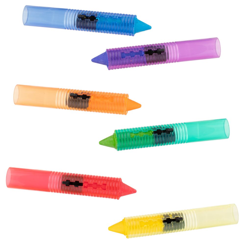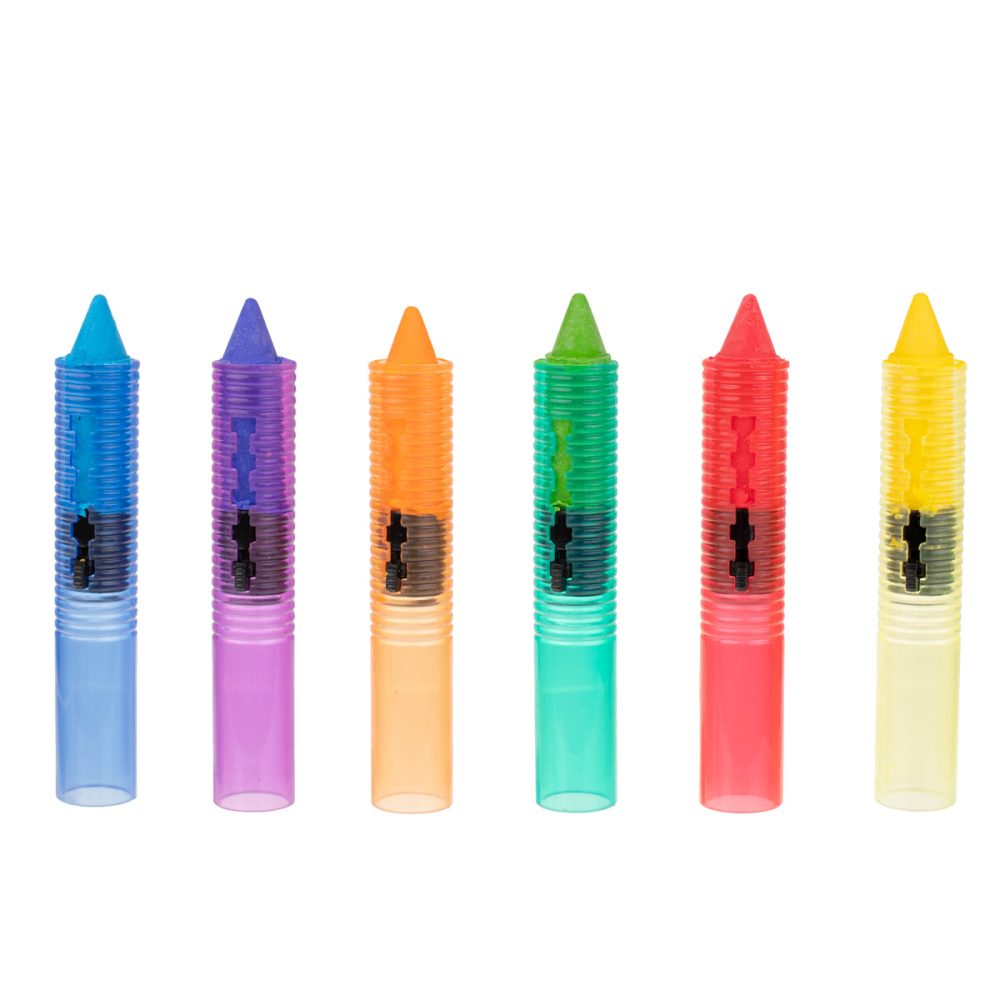 Rinkinį sudaro 6 kreidelės: geltona, oranžinė, raudona, violetinė, mėlyna, žalia.