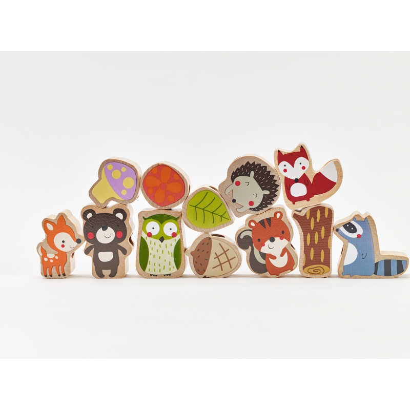 – Rinkinį sudaro medinė „adata” su virvele ir 12 varstomų kaladėlių, kuriose pavaizduoti įvairūs miško gyvūnai ir augalai, pvz.: ežiukas, pelėda, meškiukas, lapas, grybas;